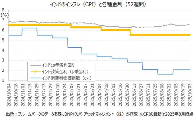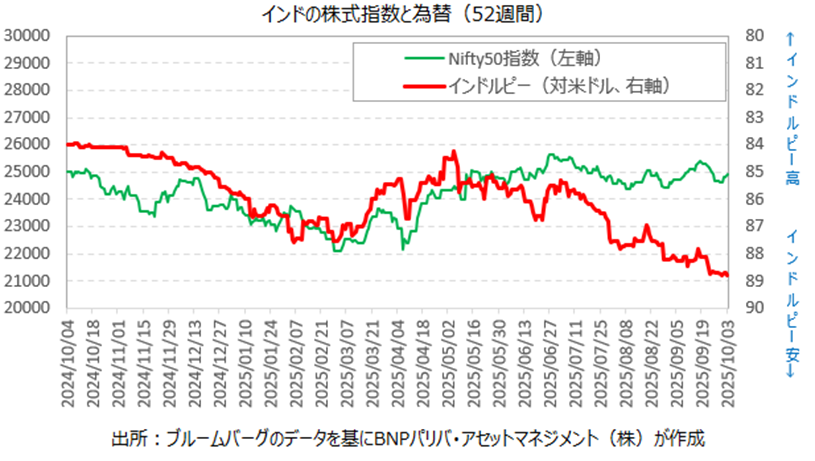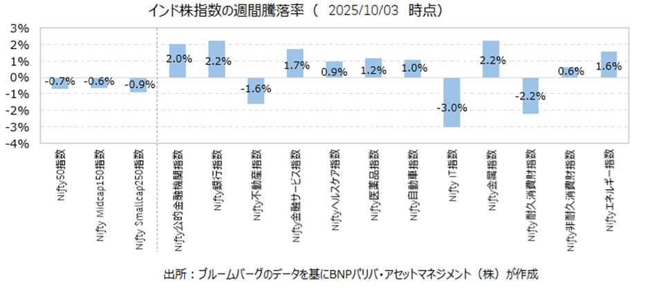前週のインド株式市場は、プラス圏に浮上する場面もありましたが、週間では小幅な下落となりました。インド中央銀行(RBI)の金融緩和的な政策スタンスや祝祭シーズンの需要への楽観的見通しが下支えとなる一方で、米国との貿易協定の不確実性、トランプ米政権による高度技能職向けの就労ビザ「H-1Bビザ」の申請手数料引き上げなどが引き続き重しとなっています。また、通貨インド・ルピー安(対米ドル)を背景に、外国人投資家(FIIs)の売り越し傾向が続いており、週を通じて807億ルピーを売り越しました。一方で、国内投資家(DII)は、1,383億ルピーを買い越しました。主要企業で構成されるNifty50指数は、前週比で0.7%の下落となりました。規模別の指数では、Nifty Midcap150指数とNifty Smallcap250指数は、それぞれ0.6%と0.9%の下落となりました。インド株のVIX(ボラティリティ指数)は4.4%下落しています。商品市場では、原油供給の増加やOPECプラスによる増産期待などを背景に、原油価格が5%ほど下落し、64ドル近辺で推移しています。